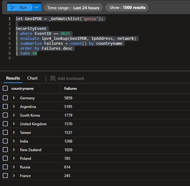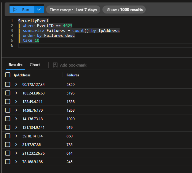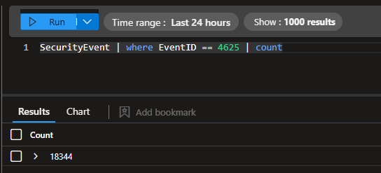 Running a simple KQL query, it tells us that we had exactly 18,344 failed login attempts over the 13 hour window.