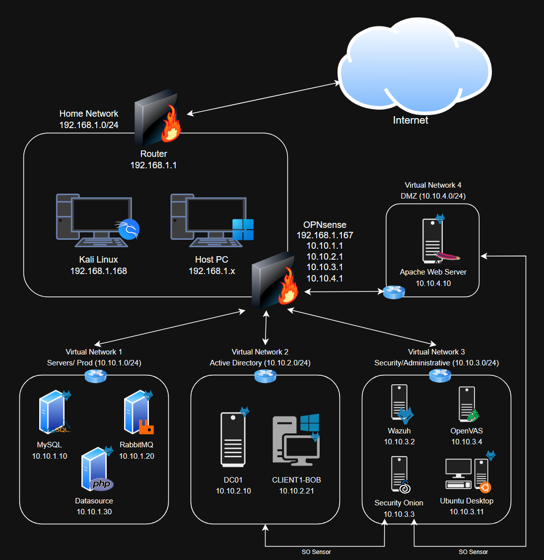 | Security/Admin (SOC) | 10.10.3.0/24 | Security & admin tools | Wazuh, Security Onion, OpenVAS, Ubuntu Desktop |