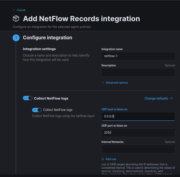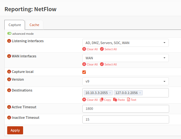 This is my configuration. It is basically listening on all interfaces and reporting to the Security Onion VM at port 2055. However, we still need to configure Security Onion’s side to receive the data.