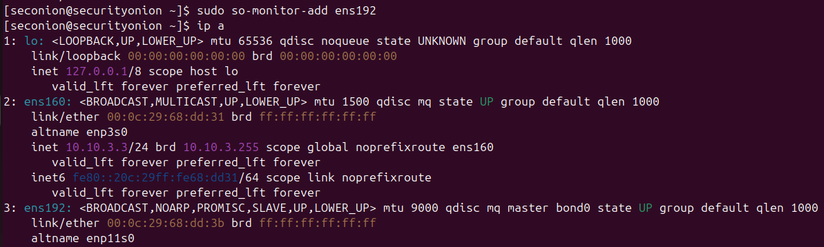 sudo so-monitor-add ens192to assign this interface as the monitoring interface. Notice that the adapter is set to promiscuous mode by default. This adapter should NOT have an IP address.