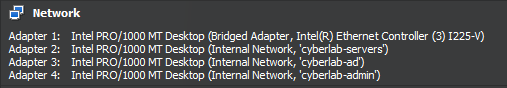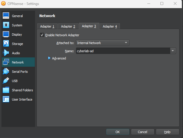 Enable Adapter 3 and set it to internal network for our Active Directory clients (cyberlab-ad)