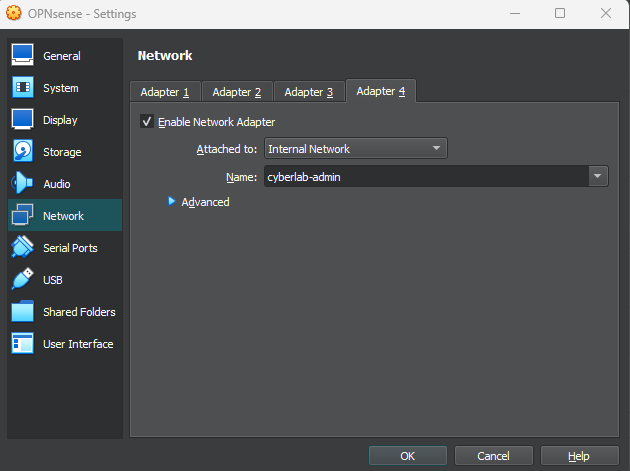 Enable Adapter 4 and set it to internal network for our administrators/SOC analysts (cyberlab-admins)