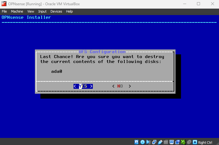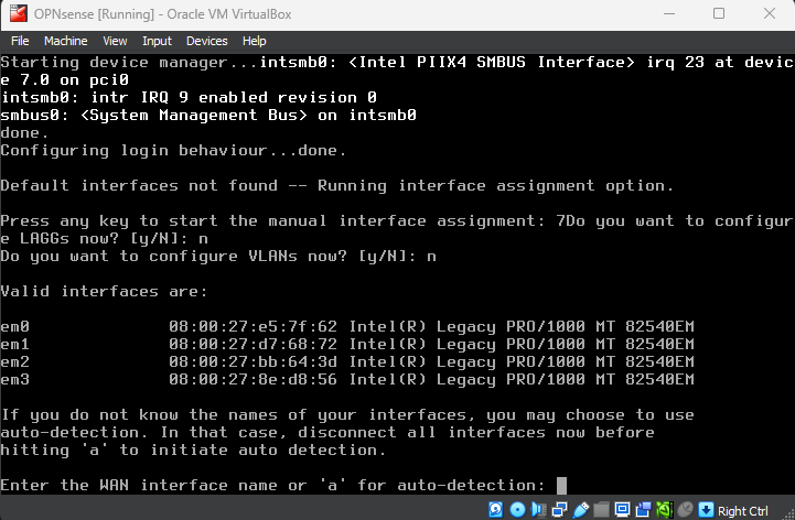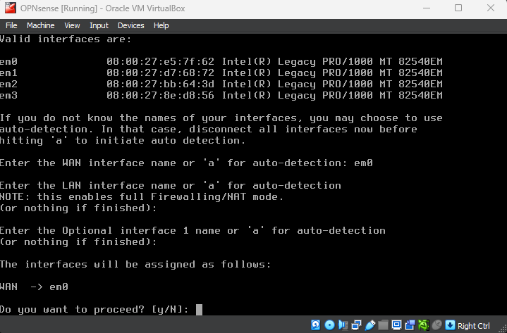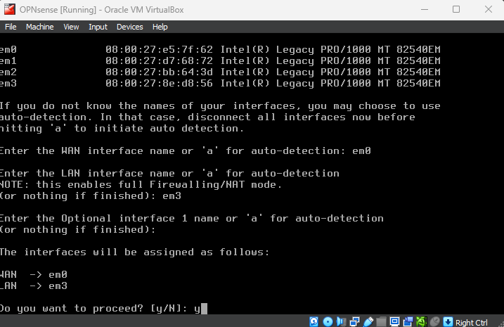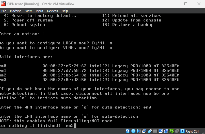 When asked for the WAN interface name, select the name that corresponds to the bridged adapter. It is usually em0 by default, but double check the MAC address to make sure.
