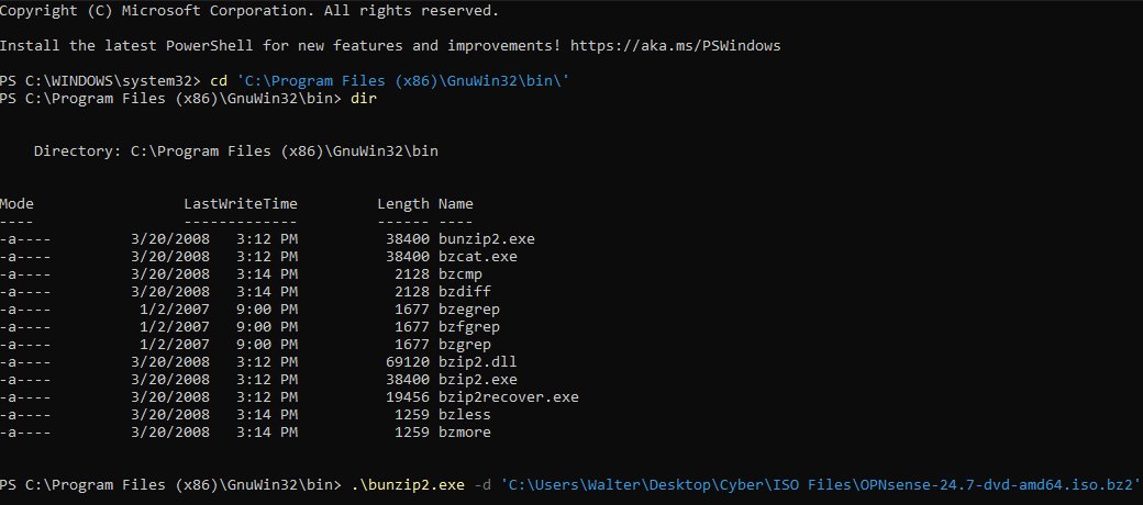 Once you downloaded bzip2, open PowerShell as administrator and navigate to the default directory where the bzip utilities are stored