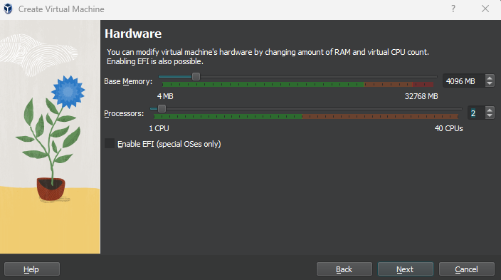 I chose 4GB of RAM and 2 CPUs. You can always adjust this later if needed.