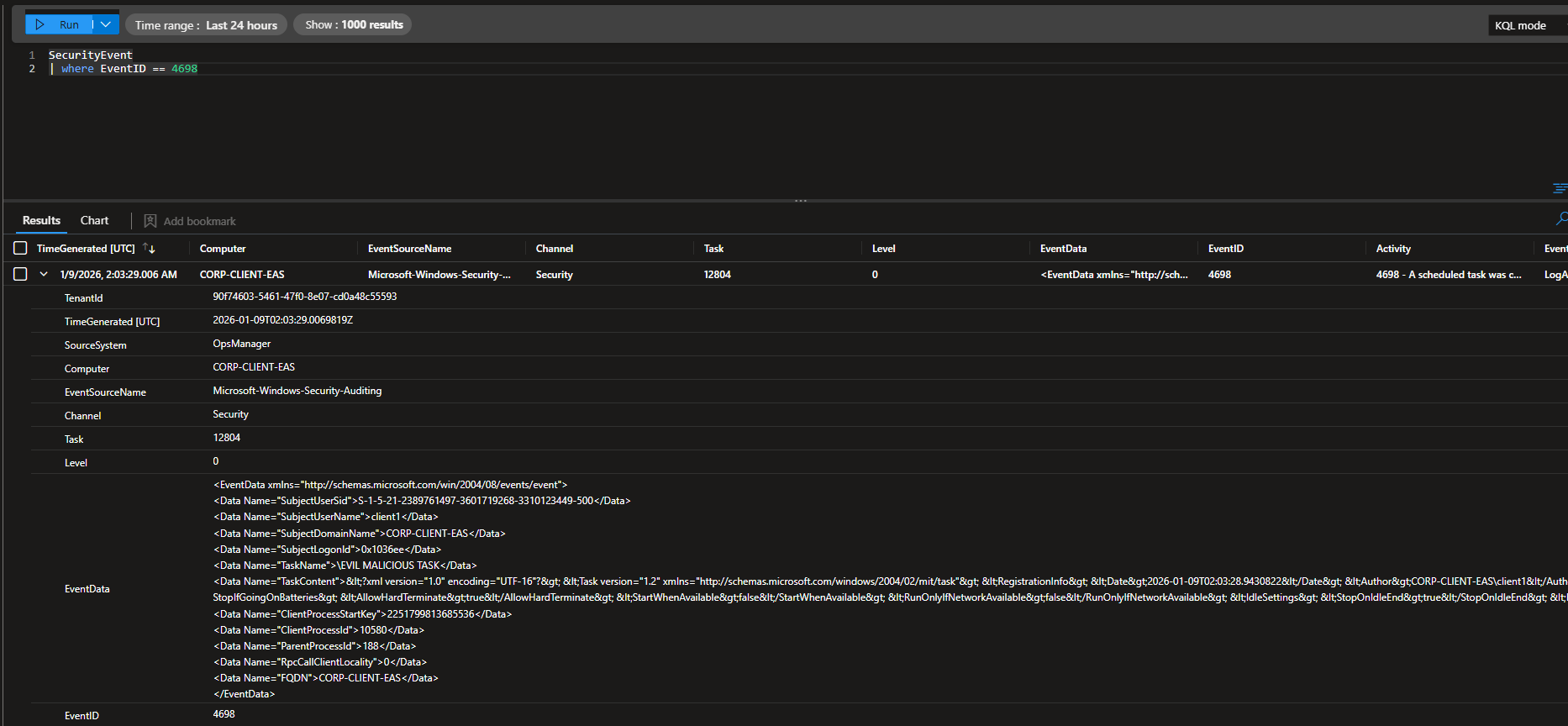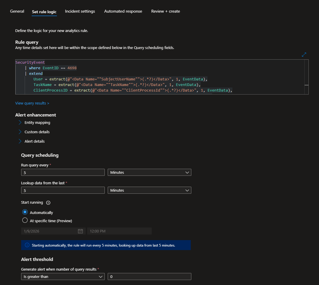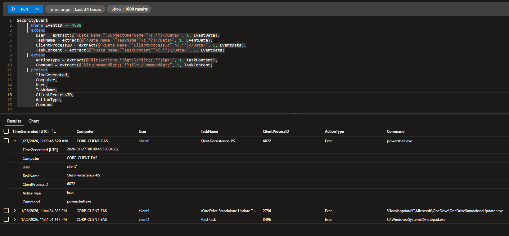 - Targets Event 4698 for scheduled task creation, a common persistence technique