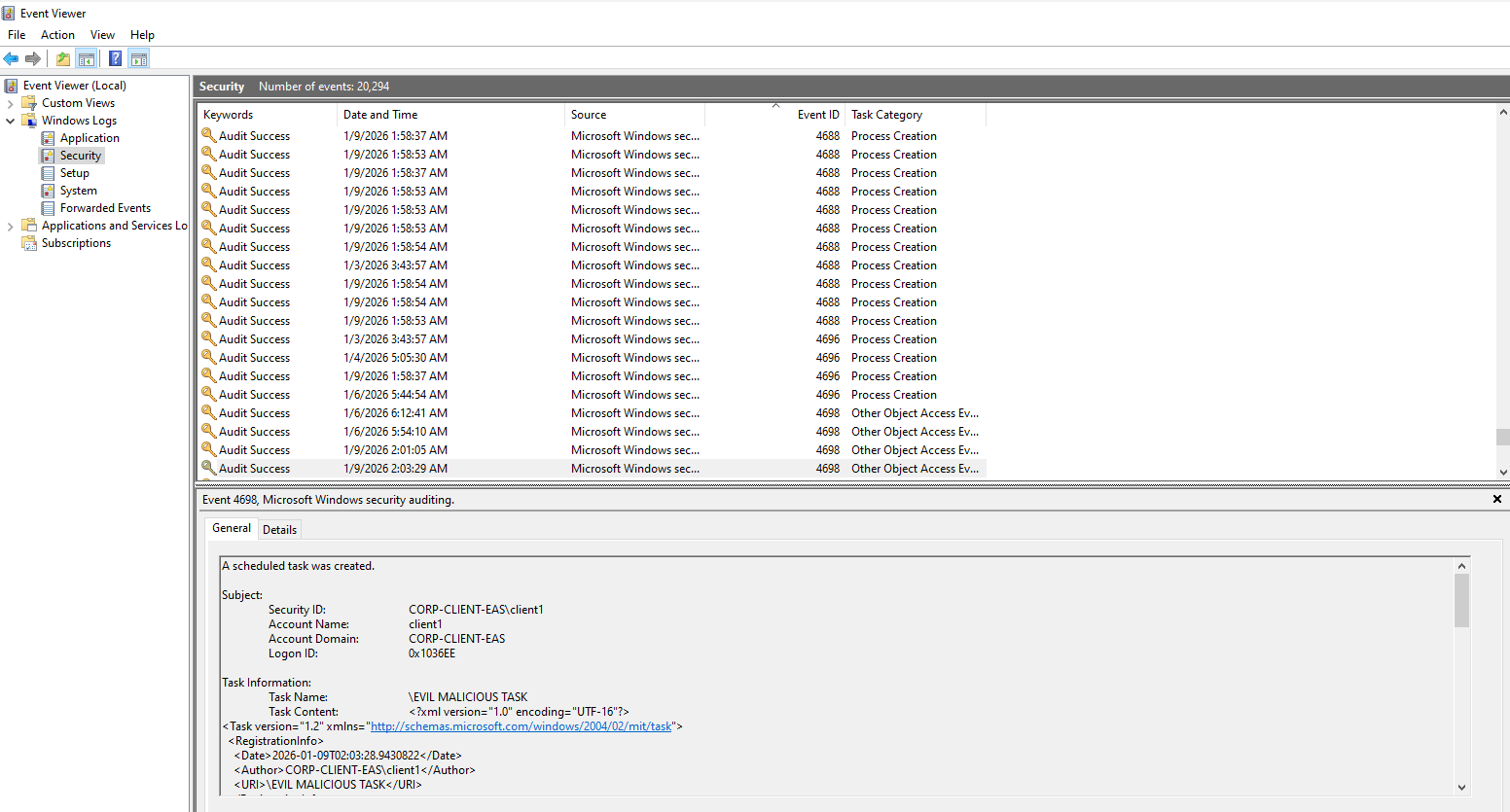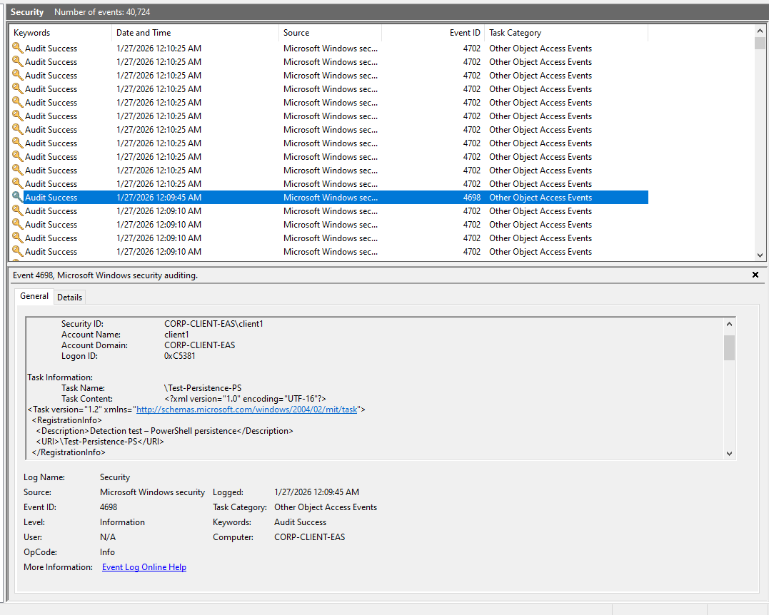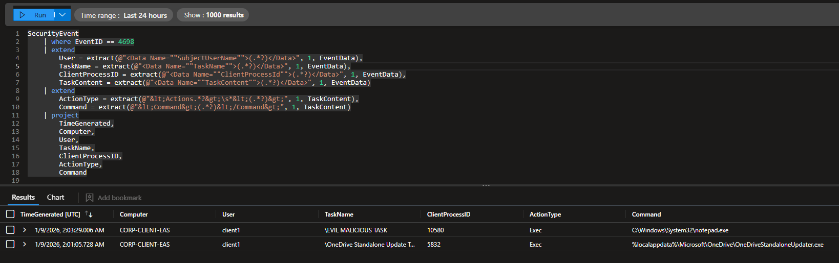 - Targets Event 4698 for scheduled task creation, a common persistence technique