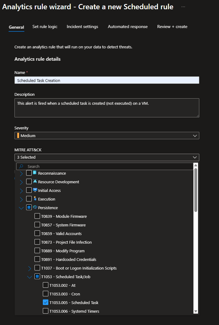 For MITRE, this alert pretty much captures scheduled tasks so I mapped it to T1053.005
