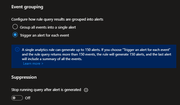 Under Event grouping, select Trigger an alert for each event and leave Suppression off