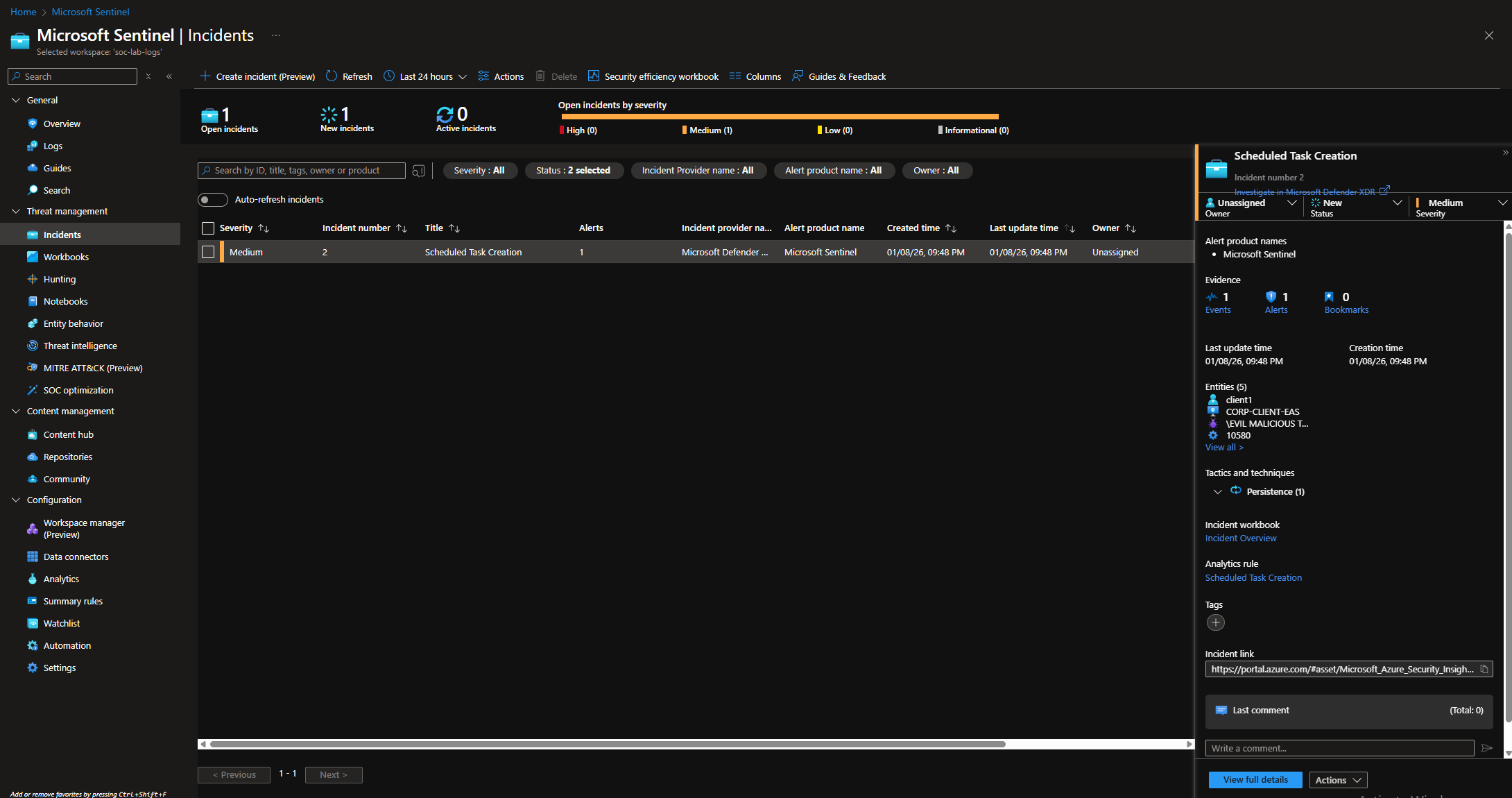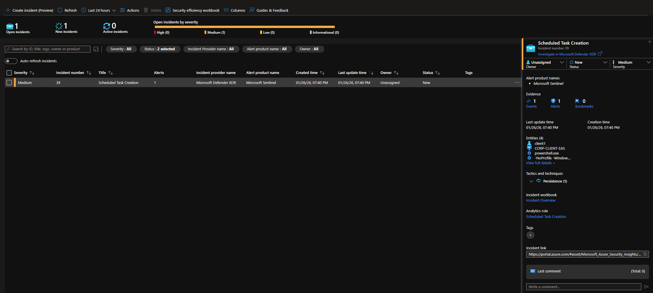Head back to the Incidents tab, and wait for our alert to appear. You may need to run the PowerShell script again, but use a different task name or the alert may not get fired.
