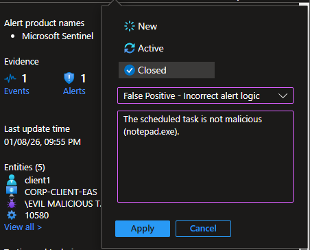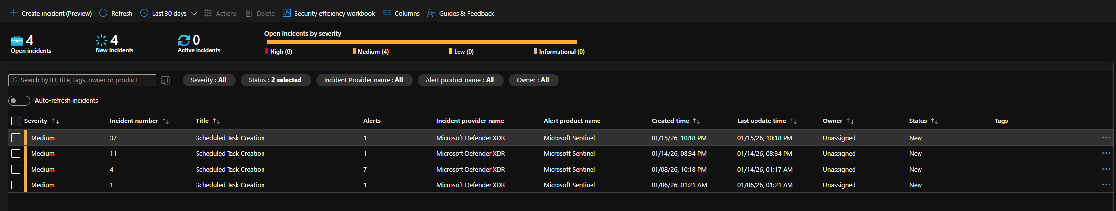 When leaving my VM running for the RDP Blocking Automation tests, the scheduled task detection got fired multiple times and a few incidents were generated.