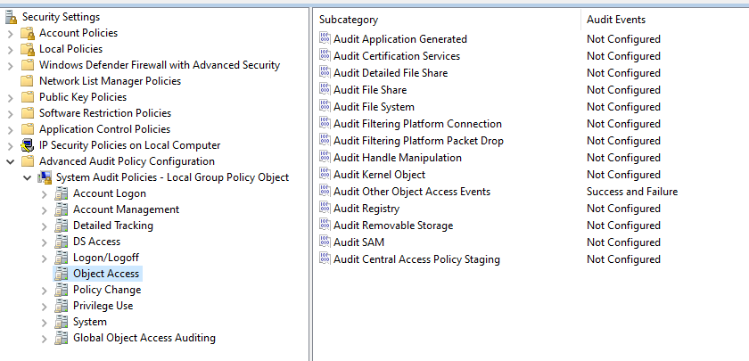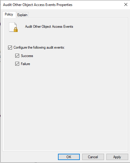 After clicking on Object Access, on the right hand side, click Audit Other Object Access Events