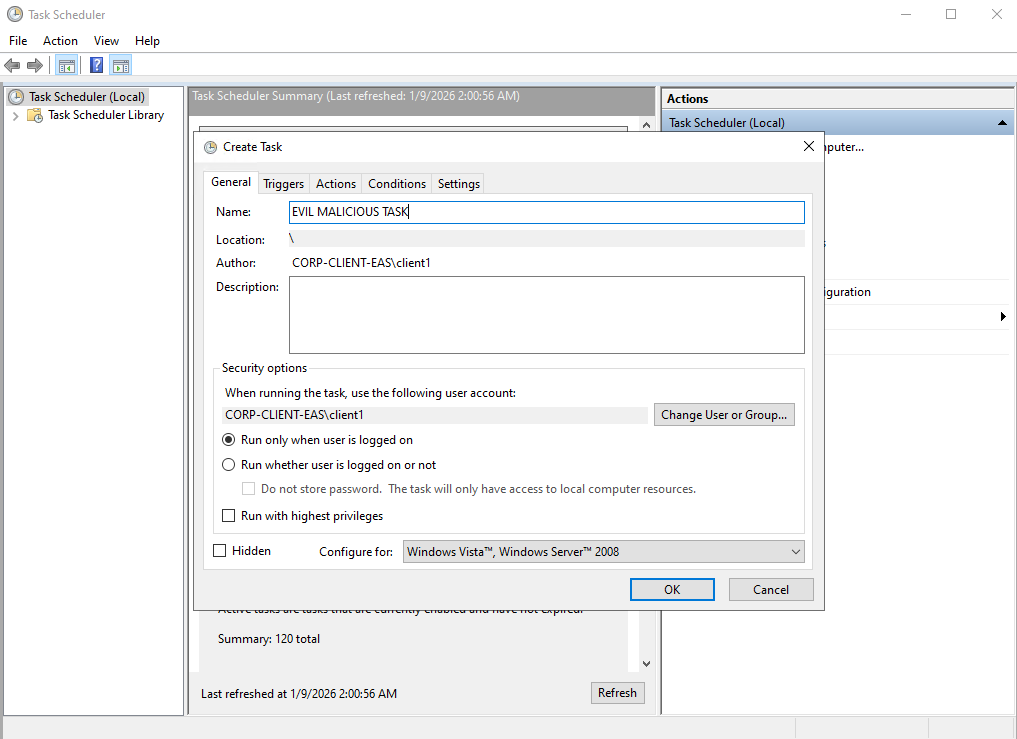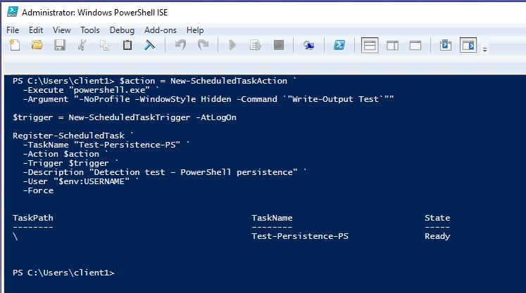This is just a test script that creates a scheduled task to mimic malware persistence behavior. It runs a hidden PowerShell session at logon. We want to capture this type of behavior in our detection.