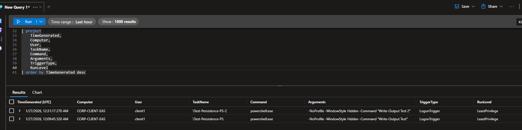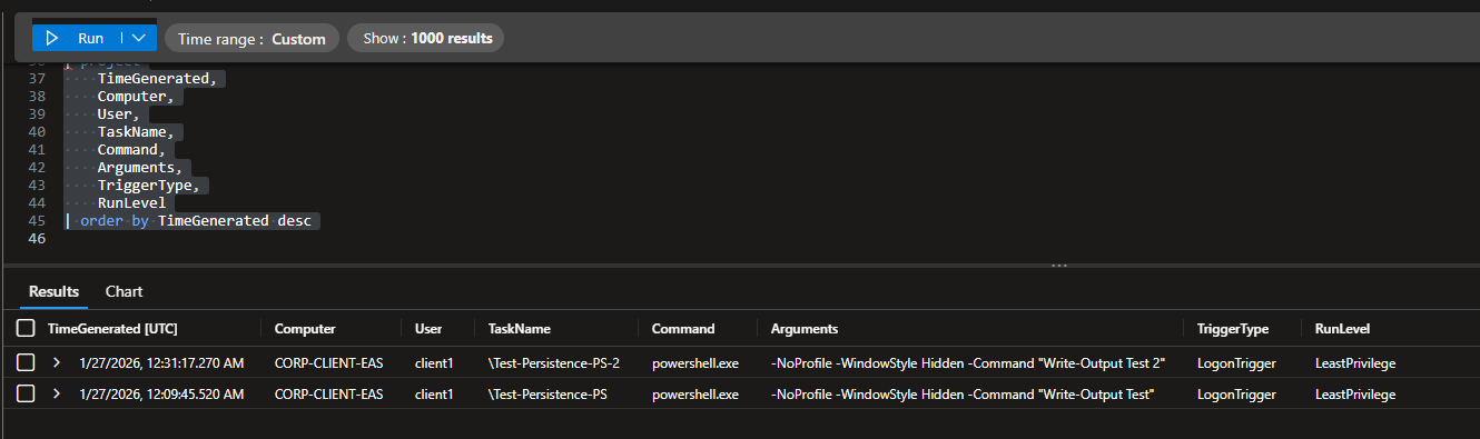 Keep note of the 3 alerts: 2 are irrelevant to what we want our detection to capture, and the other captures PowerShell being executed (the task named Test-Persistence-PS).