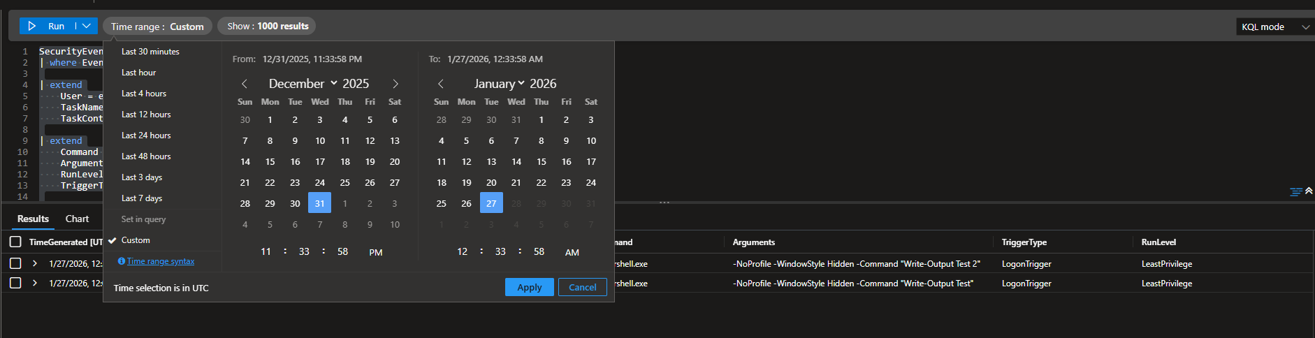 Using the updated query, only 2 PowerShell related events were captured. These were the mock tests I ran to mimic attacker persistence. We effectively went from 18 alerts to 2 high confidence alerts.