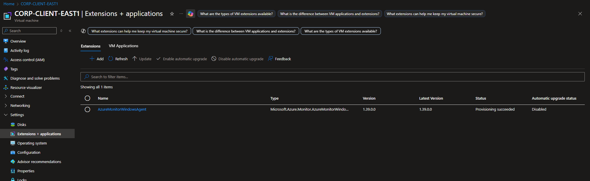 Under status for AzureMonitorWindowsAgent, it should show “Provisioning succeeded”