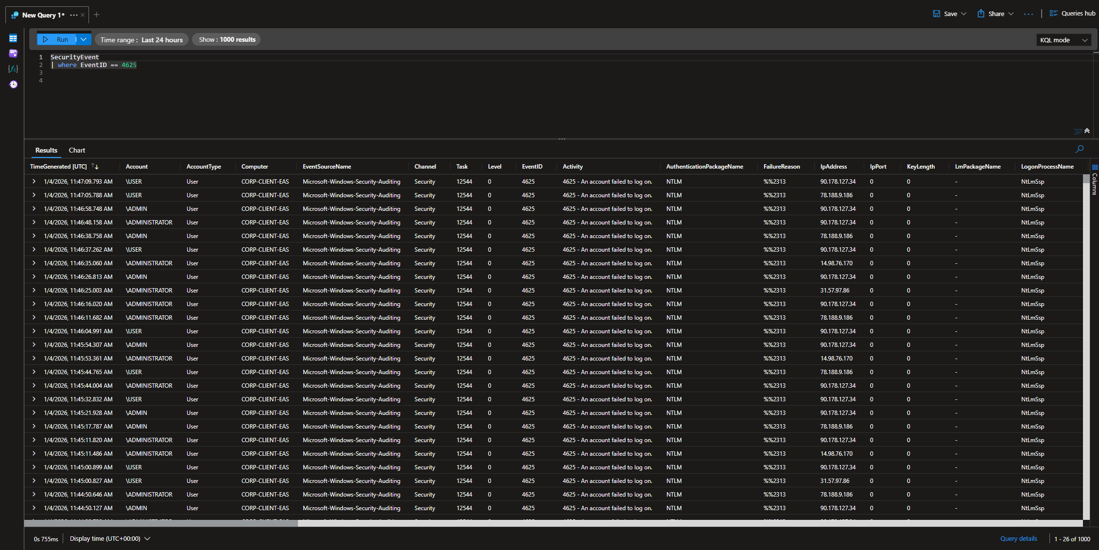 I ran a query that looks for failed log in attempts (4625), and I got thousands of logs. Notice the different IP addresses.