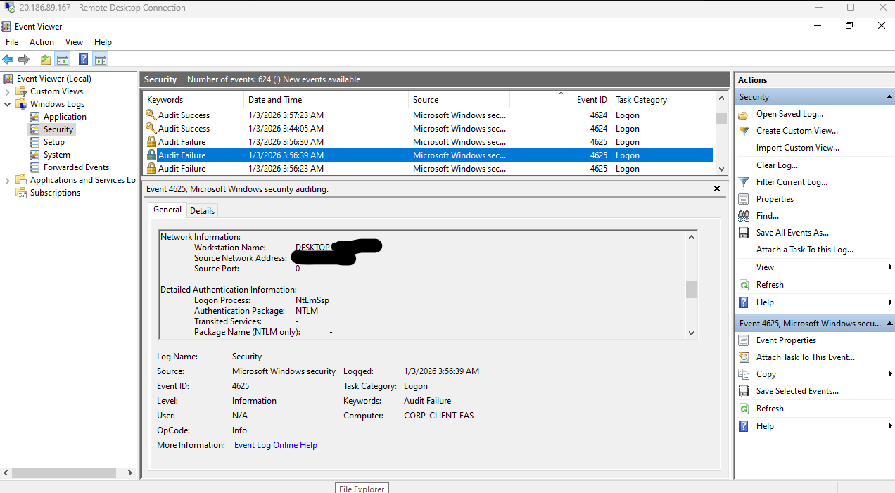 Additionally, it will show the workstation name and IP address of the device that tried to access the VM. This showed my information, which I blurred out for privacy. This is valuable data for investigations, so we want these logs in a centralized repository.