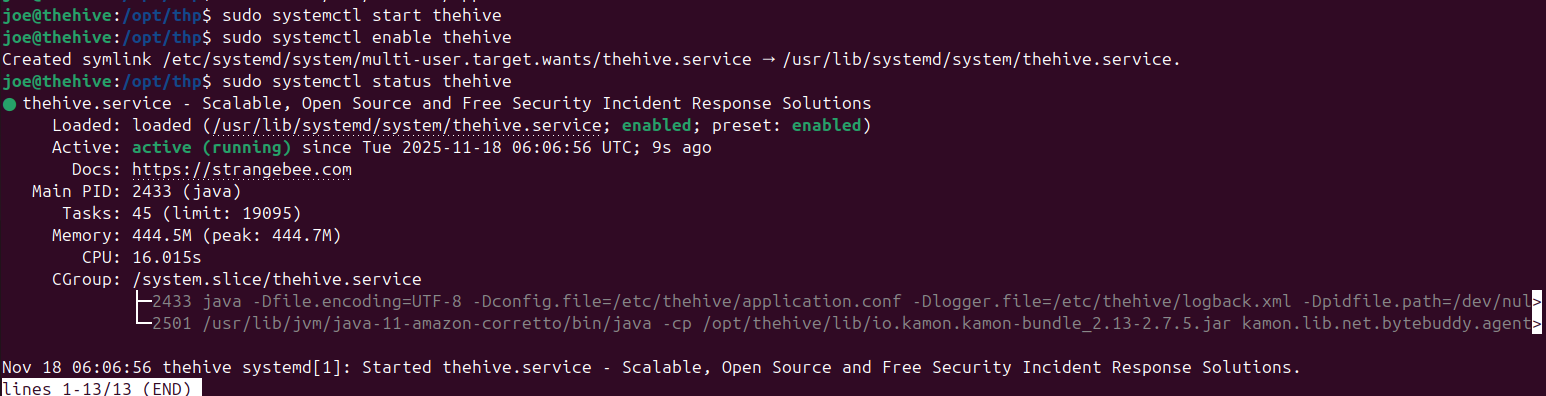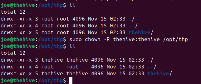 Change the ownership of this directory, it should be owned by the thehive user and group: sudo chown -R thehive:thehive /opt/thp