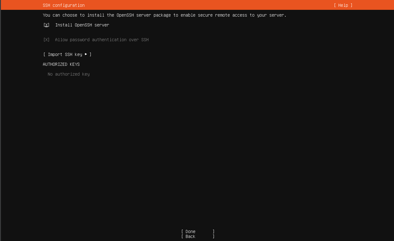 Make sure to check “Install OpenSSH server” before proceeding