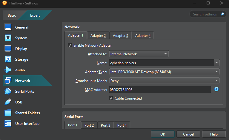 Under Network, change Adapter 1 to internal network (cyberlab-servers)