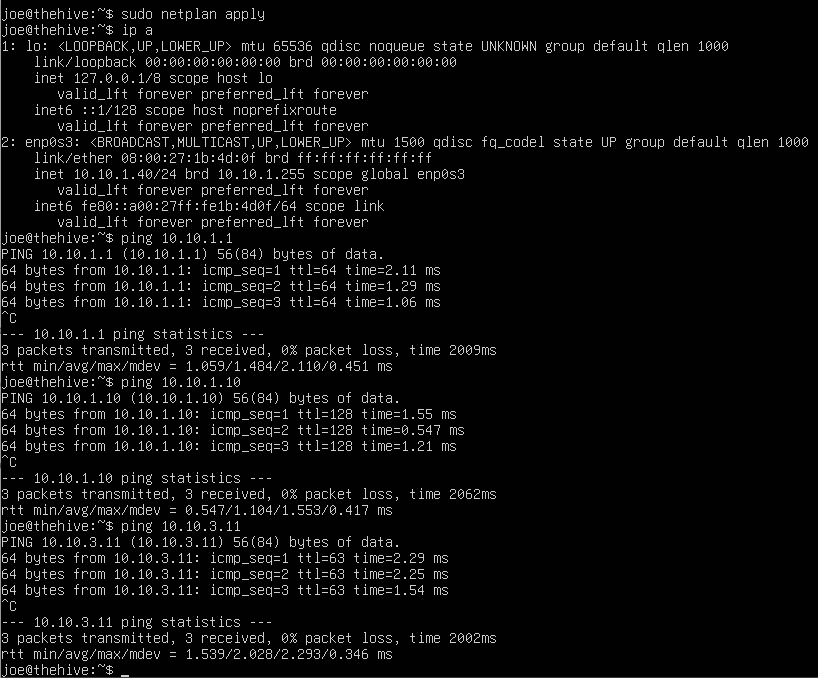 Run ip a to confirm the changes went through and run a few pings to make sure the VM can communicate with other VMs in our network