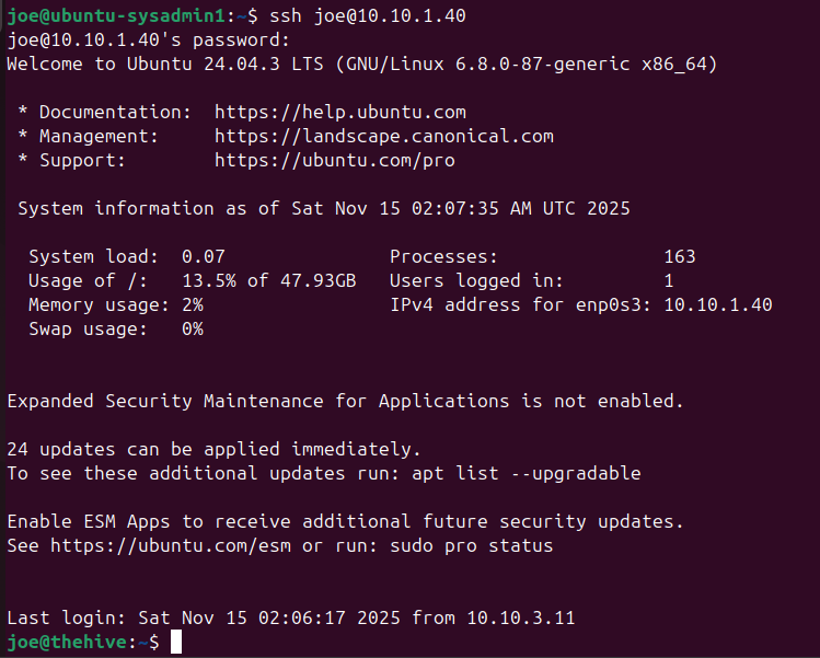 This is a bit confusing since i named the user accounts “joe” for both the Ubuntu VM and TheHive VM, however note that my shell is now “joe@thehive”.