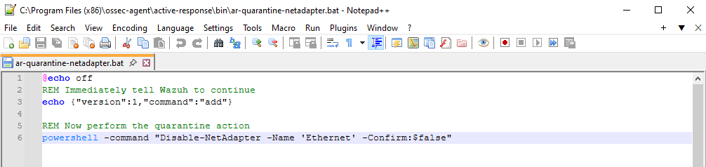 This will be done by using a Windows batch file that disables the network adapter, essentially quarantining the “infected” host.