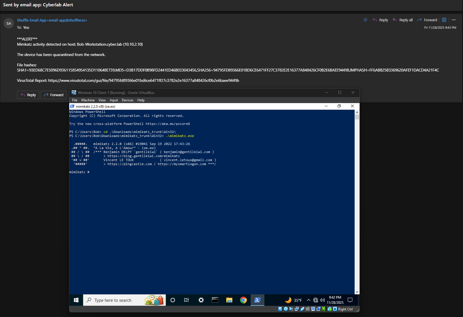 This batch file will automatically be executed when Wazuh receives an alert that Mimikatz was executed on the host.