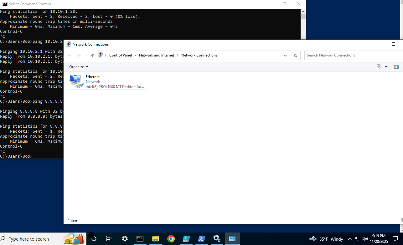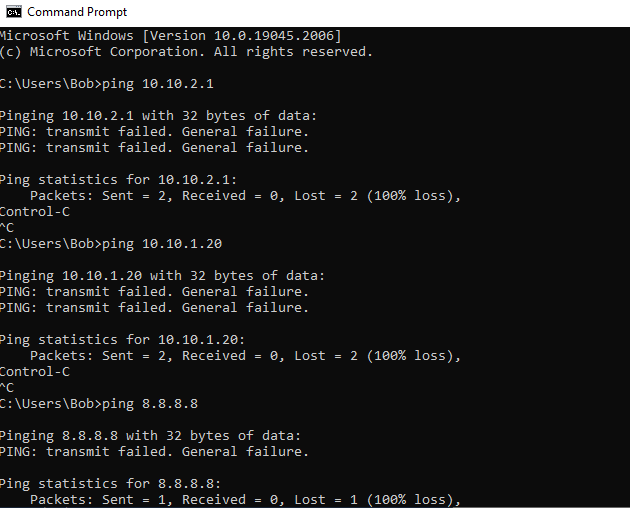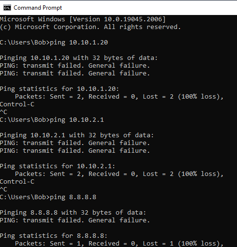 Try pinging other endpoints on the network to make sure. Notice the pings fail.