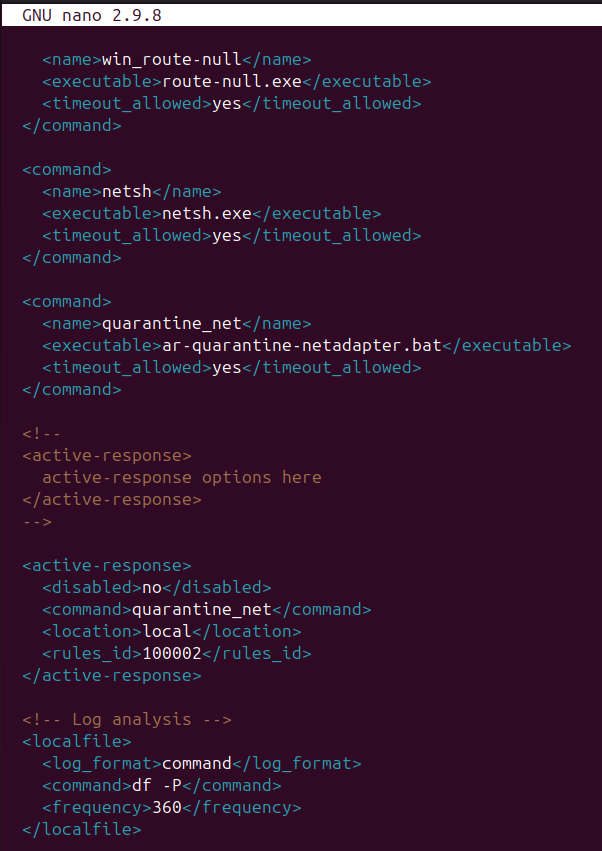 Paste the following contents; this is the definition for our quarantine command. I did this right above the Log analysis section of the config file: