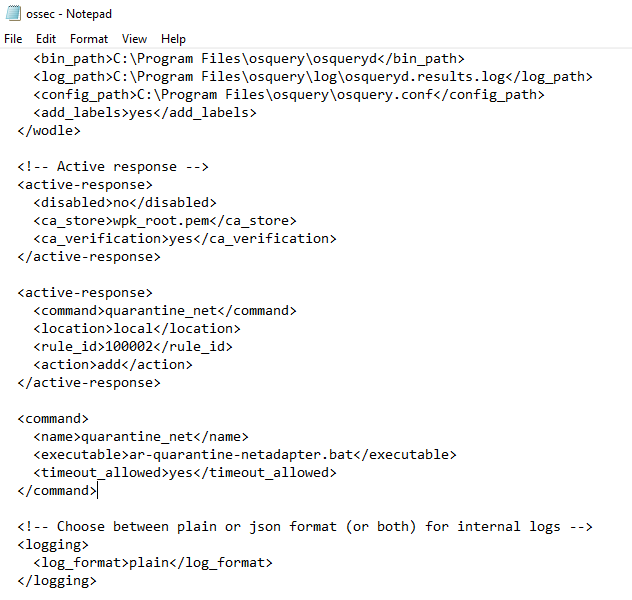 quarantine_netcommand<executable>is the file name as placed on the agent in the agent’sC:\Program Files (x86)\ossec-agent\active-response\bin\In this case, this action will executear-quarantine-netadapter.bat(quarantines the host from the network)<location>local</location>means the action runs on the endpoint where the alert occurred (in this case, Bob-Workstation/ the Windows 10 client)