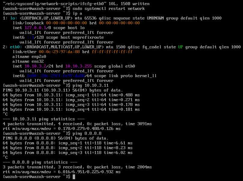 After Wazuh is finished installing, change the IP address of the VM. I am still using network-scripts over NetworkManager. I gave this VM the IP address 10.10.3.2