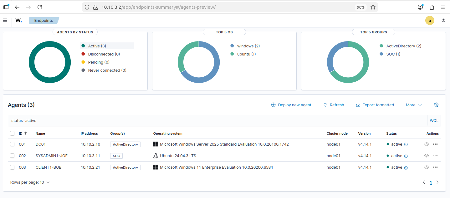 - Wazuh agents deployed on both Windows machines and the Ubuntu VM