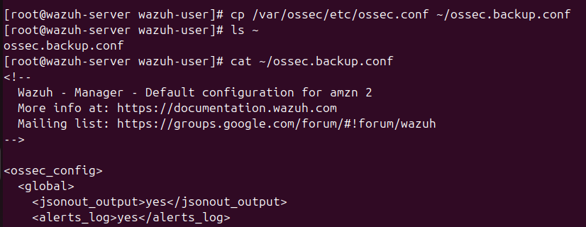 Command: cp /var/ossec/etc/ossec.conf ~/ossec.backup.conf
