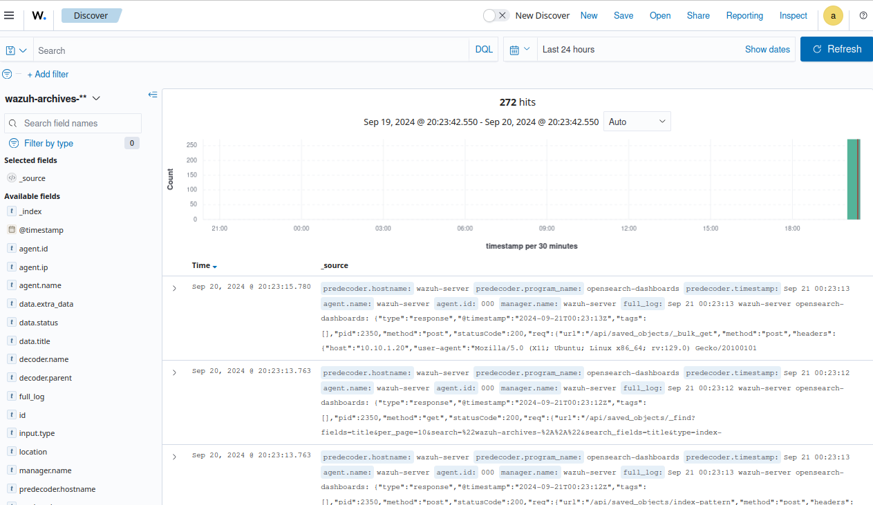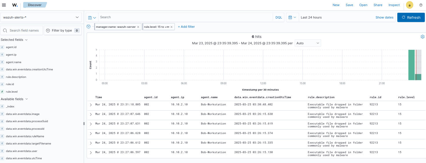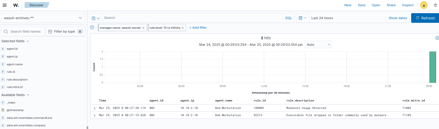 I set the fields to time, agent.id, agent.ip, rule.id, rule.description, and rule.mitre.id