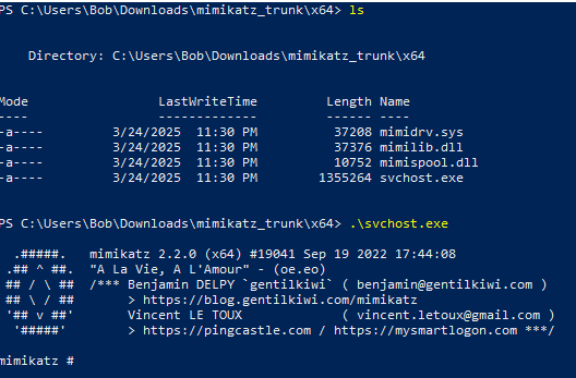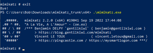 Open PowerShell if it is not already open, and run Mimikatz using the new name