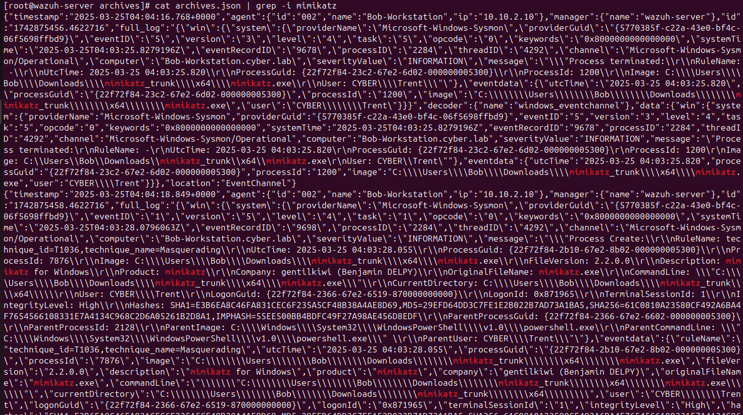 Run cat archives.json | grep - i mimikatz (ignore case sensitivity)