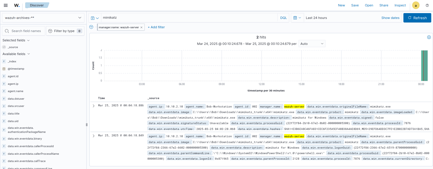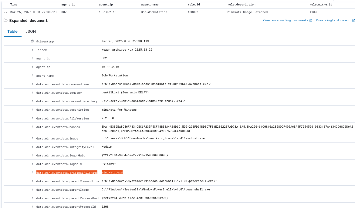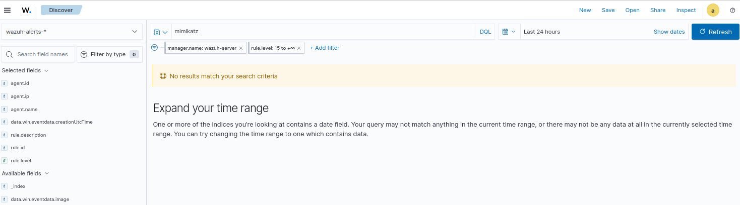 Notice that no rule or alert was triggered when Mimikatz was executed.