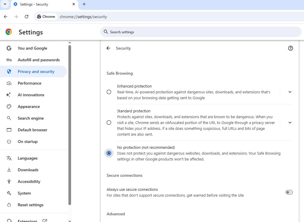 Windows will flag the Mimikatz script as malware and prevent it from being downloaded, so we are going to temporarily disable some of our security settings.