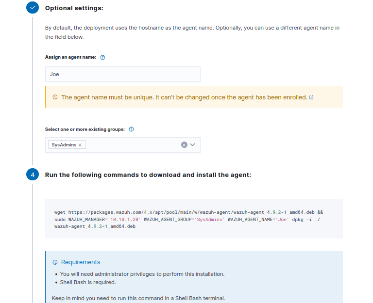 I assigned this agent to the SysAdmins group.