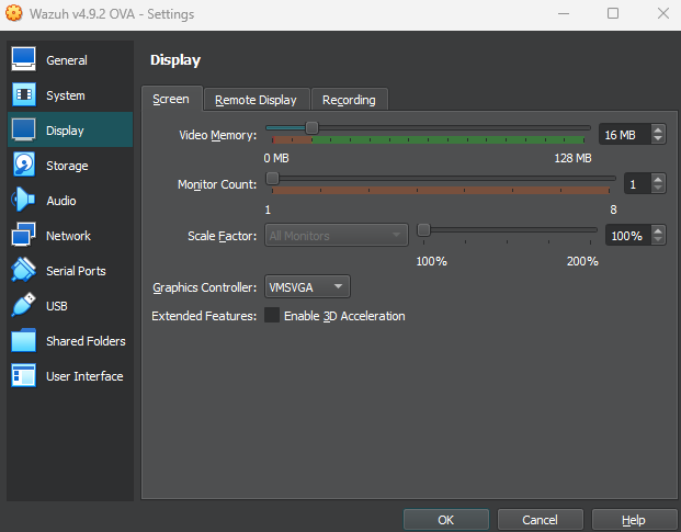 Once it is finished importing, set the graphics controller to VMSVGA in Settings > Display