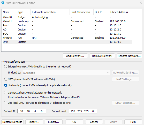 - VMnet Information: Host-only (connect VMs internally in a private network)