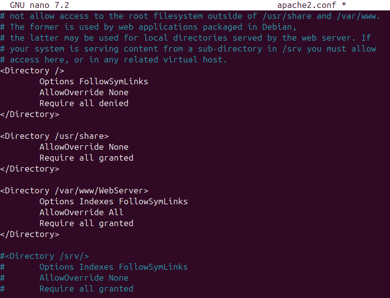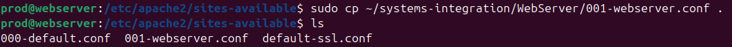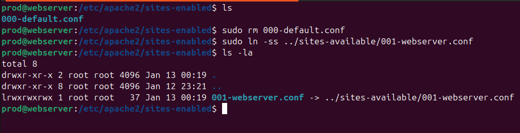 Head to /etc/apache2/sites-enabled. Delete the default config (000-default.conf) and add a symlink to our config (001-webserver.conf)