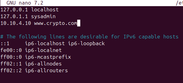 Optional: edit /etc/hosts on the Ubuntu VM add an entry for www.crypto.com, mapping it to the IP address of the Web Server VM.