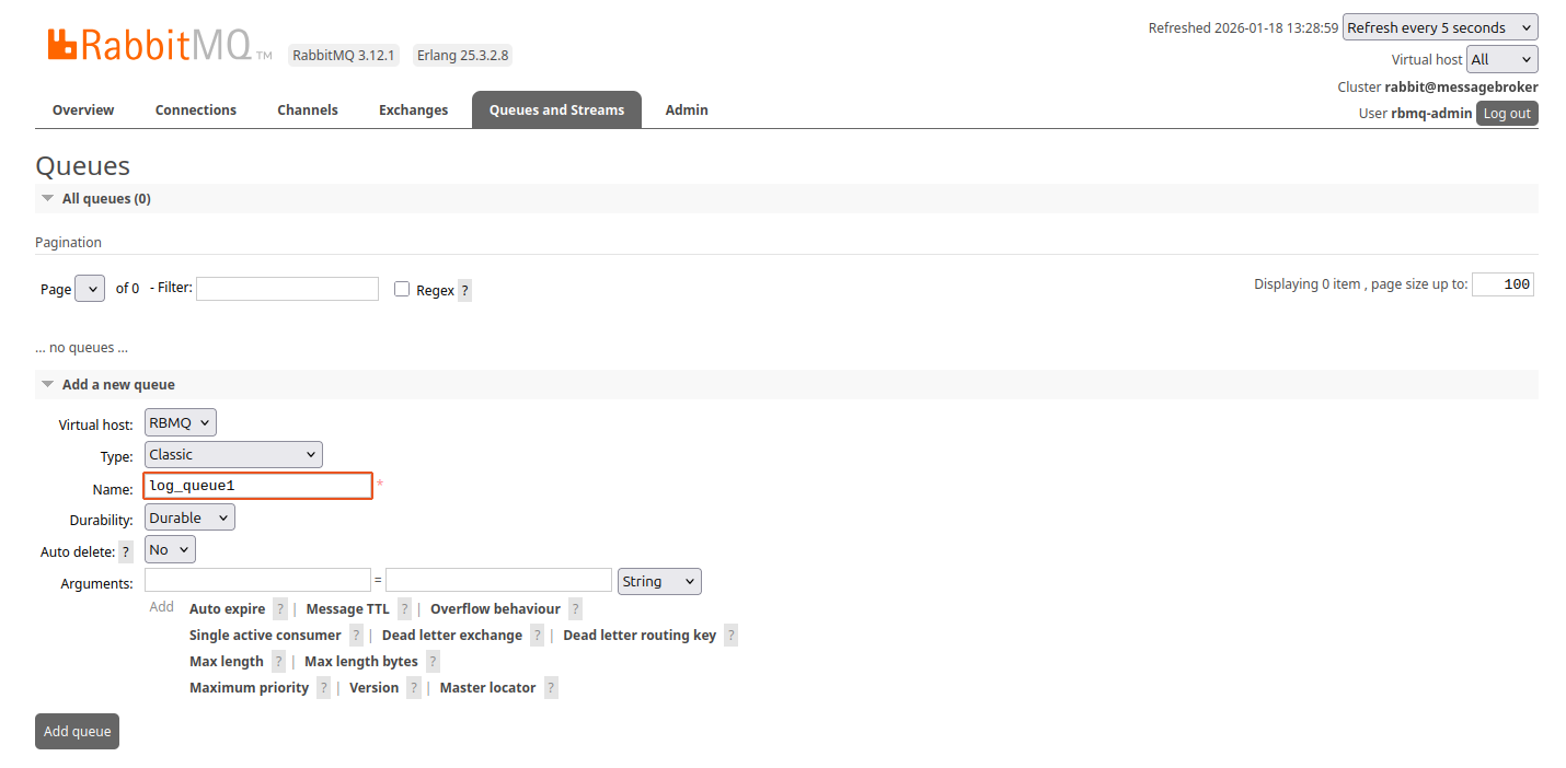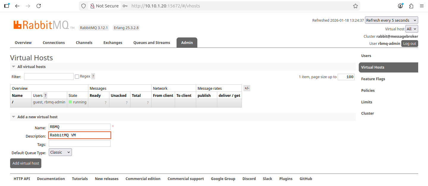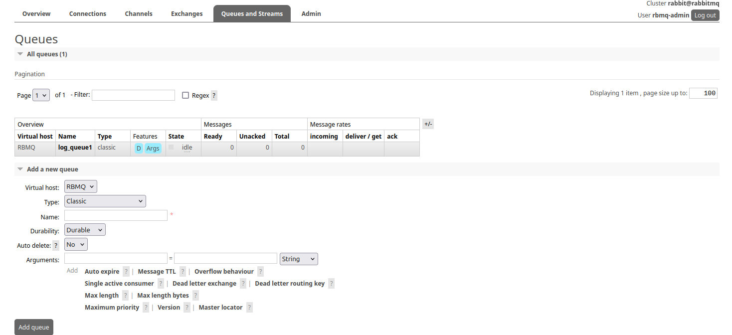 Head to the RabbitMQ web interface at 10.10.1.20:15672
