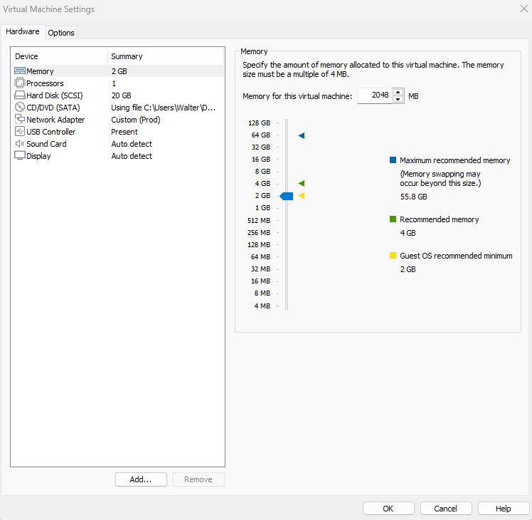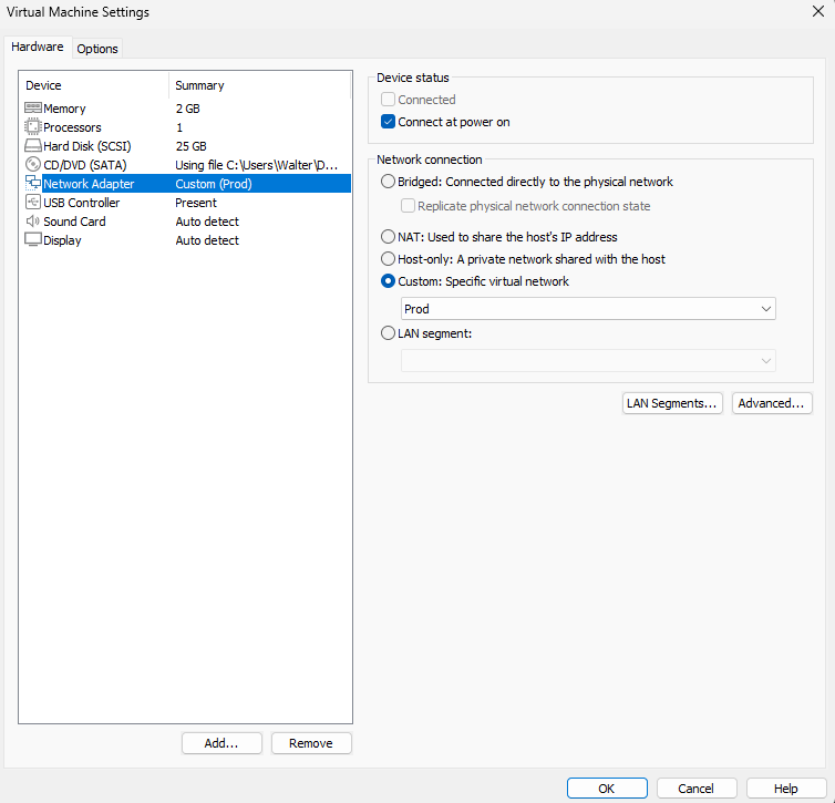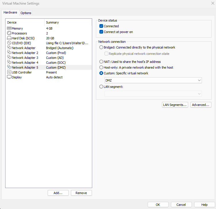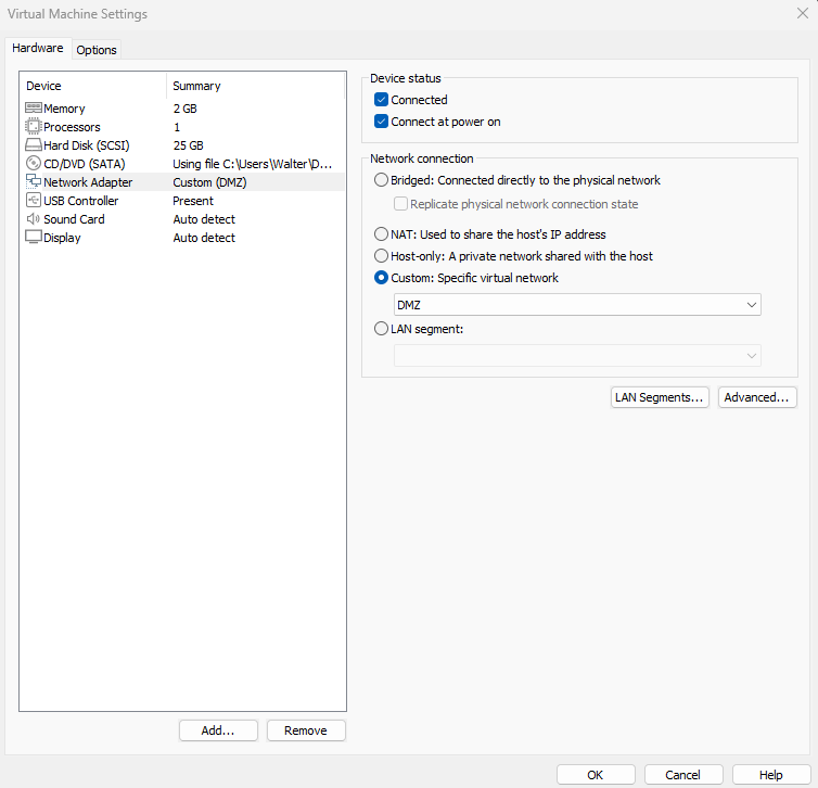 I gave this VM 2GB of RAM, 1 Processor and 25GB storage. This VM is only connected to the DMZ network.