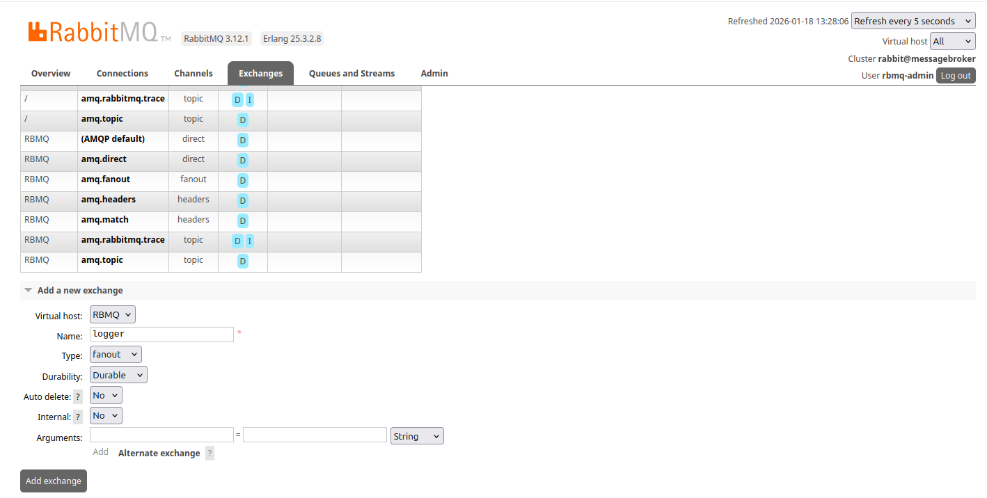 i am going to create the logger exchange first to test that the VMs can communicate with each other via RabbitMQ. Make sure to setup the database and dmz exchanges as well.