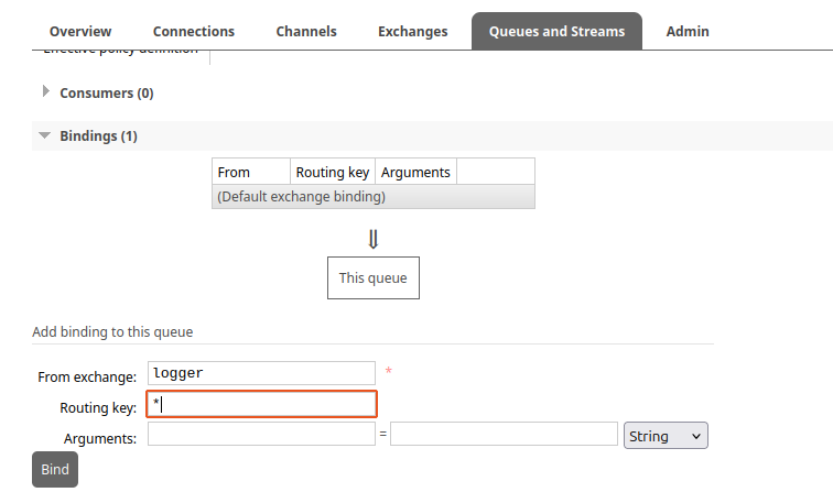 Under bindings, bind the queue to the logger exchange using the routing key *