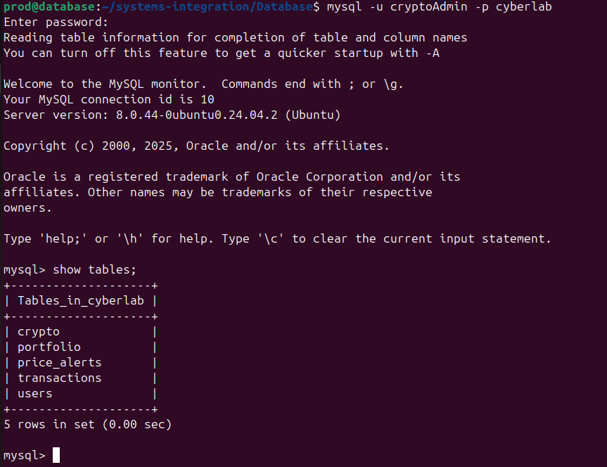 grant all privileges on cyberlab.* to 'cryptoAdmin'@localhost;